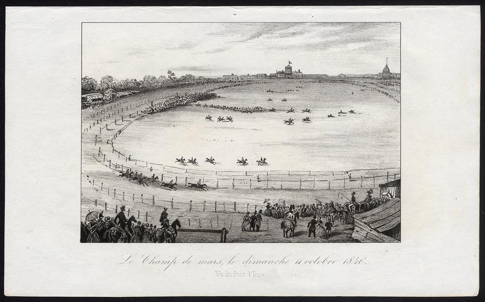 Onderwerp: Plaat: ‘Le Champ de mars, le dimanche 14 oktober 1846’. Dit bord toont de paardenrace van Champ de Mars in Parijs, Frankrijk.
