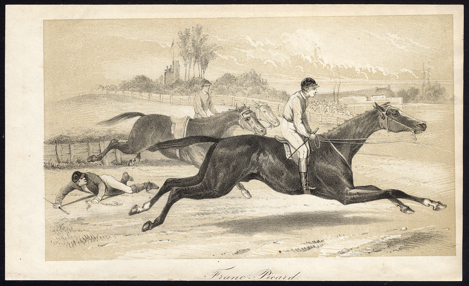 Onderwerp: Plaat: ‘Franc Picard’. Dit bord toont een paardenrace, één jockey is van zijn paard gevallen.