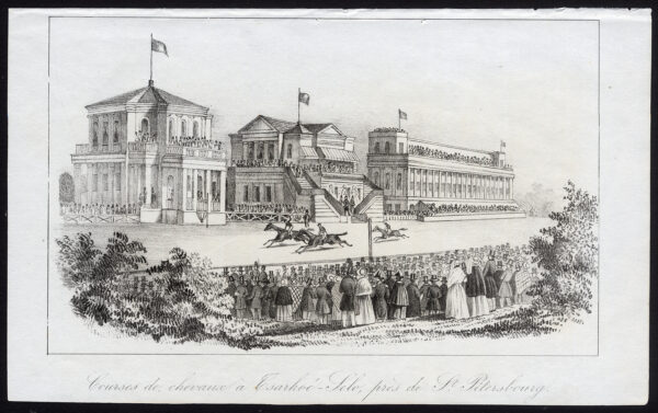 Onderwerp: Plaat: ‘Courses de chevaux a Tsarkoe-Selo, pres de St. Petersburg’. Dit bord toont een paardenrace die plaatsvindt in Tsarkoye Selo nabij Sint-Petersburg, Rusland.