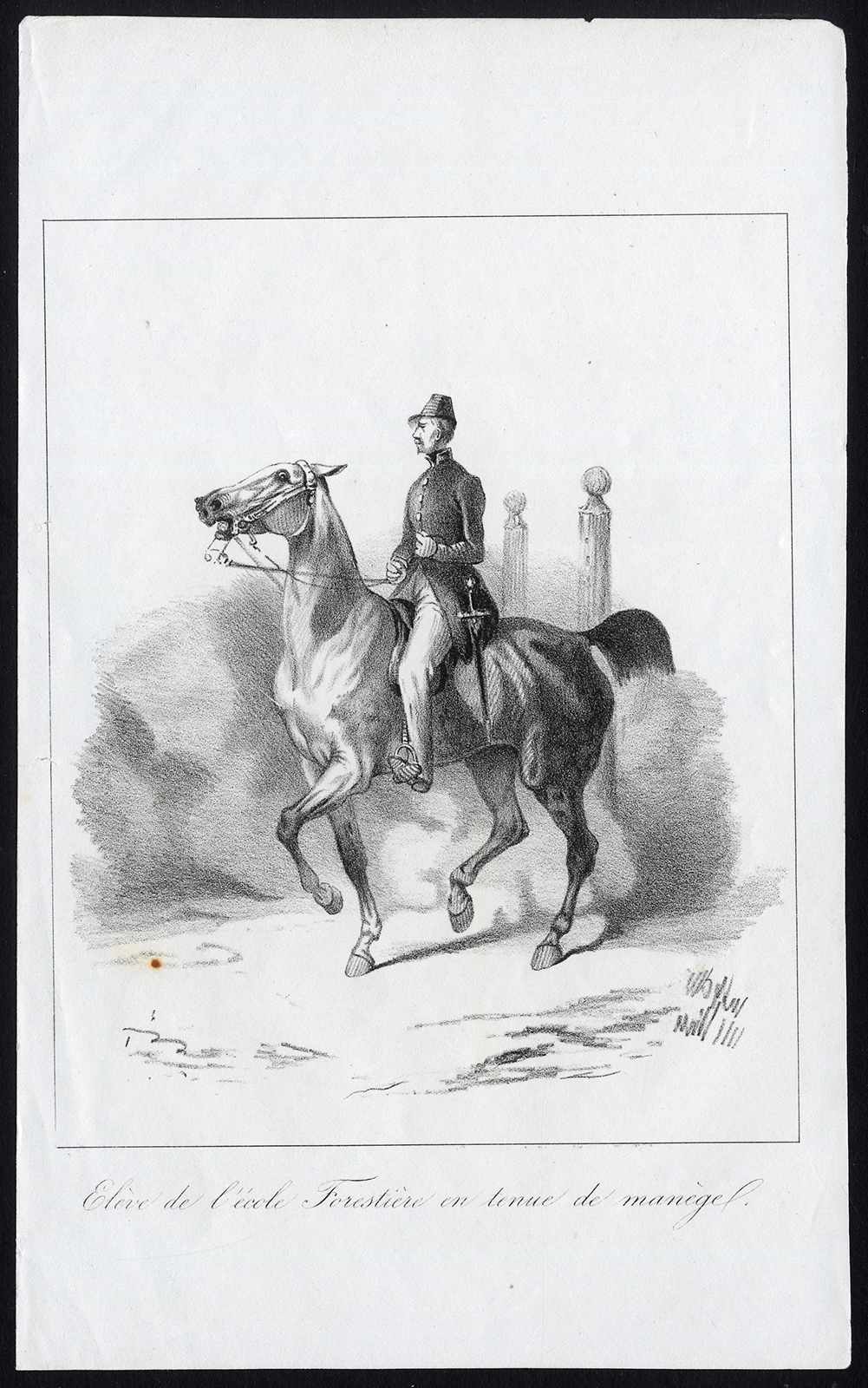 Onderwerp: Plaat: ‘Eleve de l’Ecole Forestiere en tenue de manege’. Dit bord toont een leerling van de boswachtersschool in manegekostuum.