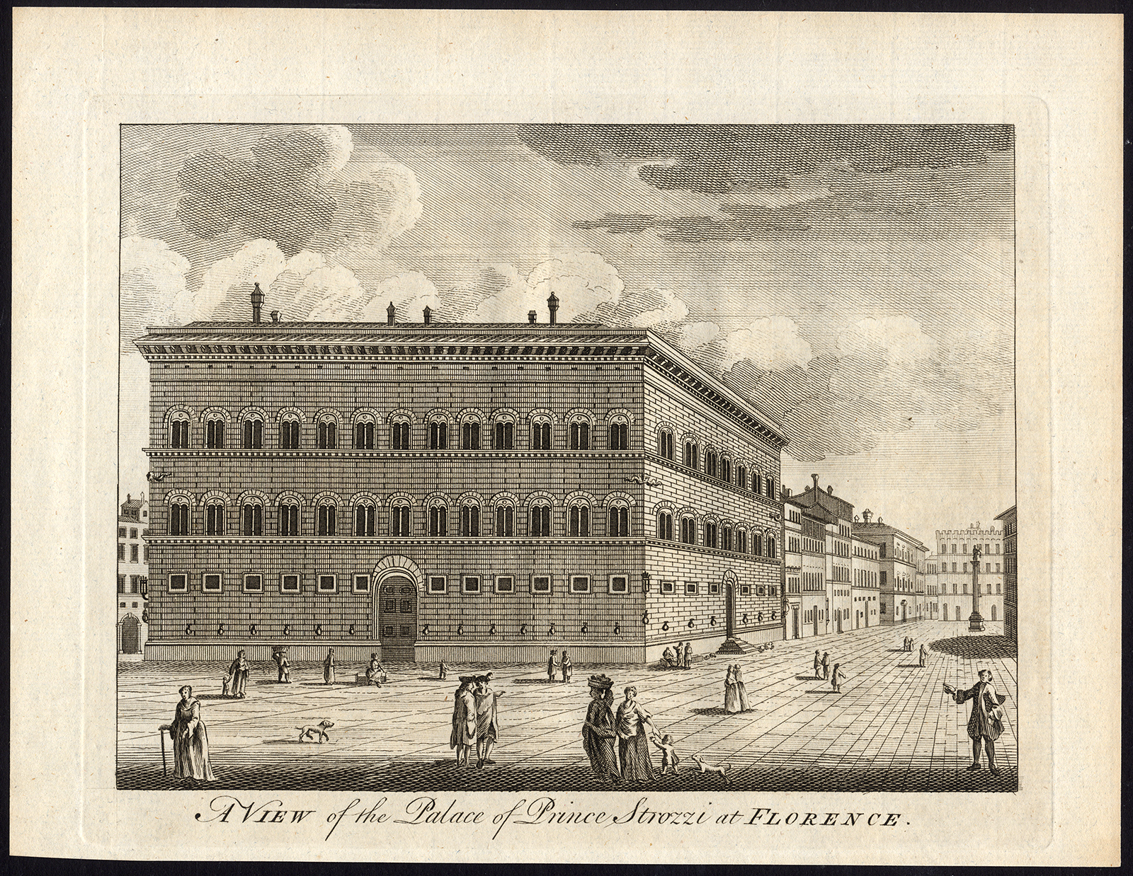 Onderwerp: Plaat: ‘Een zicht op het paleis van prins Strozzi in Florence’. Dit bord toont Palazzo Strozzi in Florence, Italië.