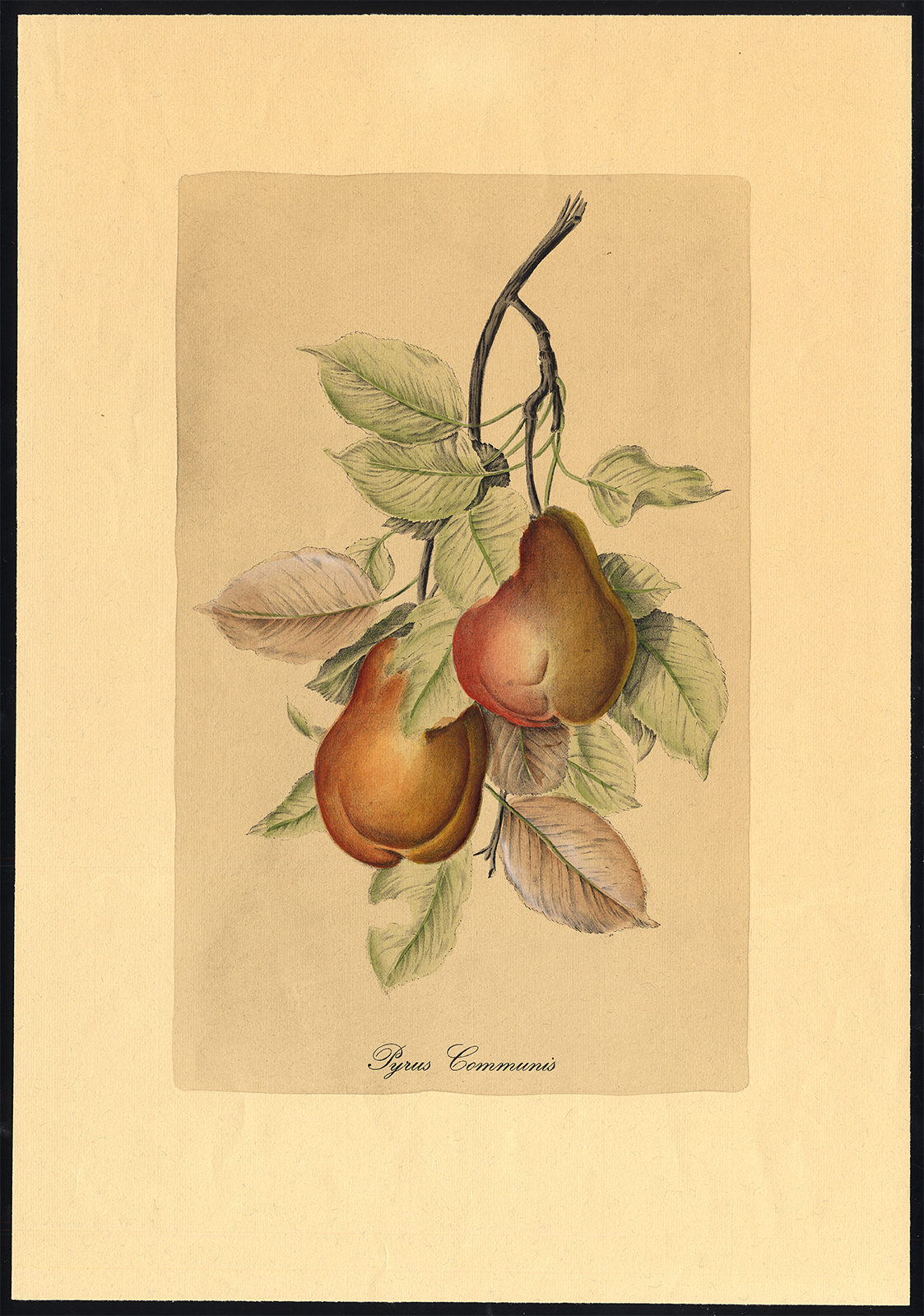 Onderwerp: Plaat: ‘Pyrus Communis’. Het toont twee Europese peren op een tak met bladeren.