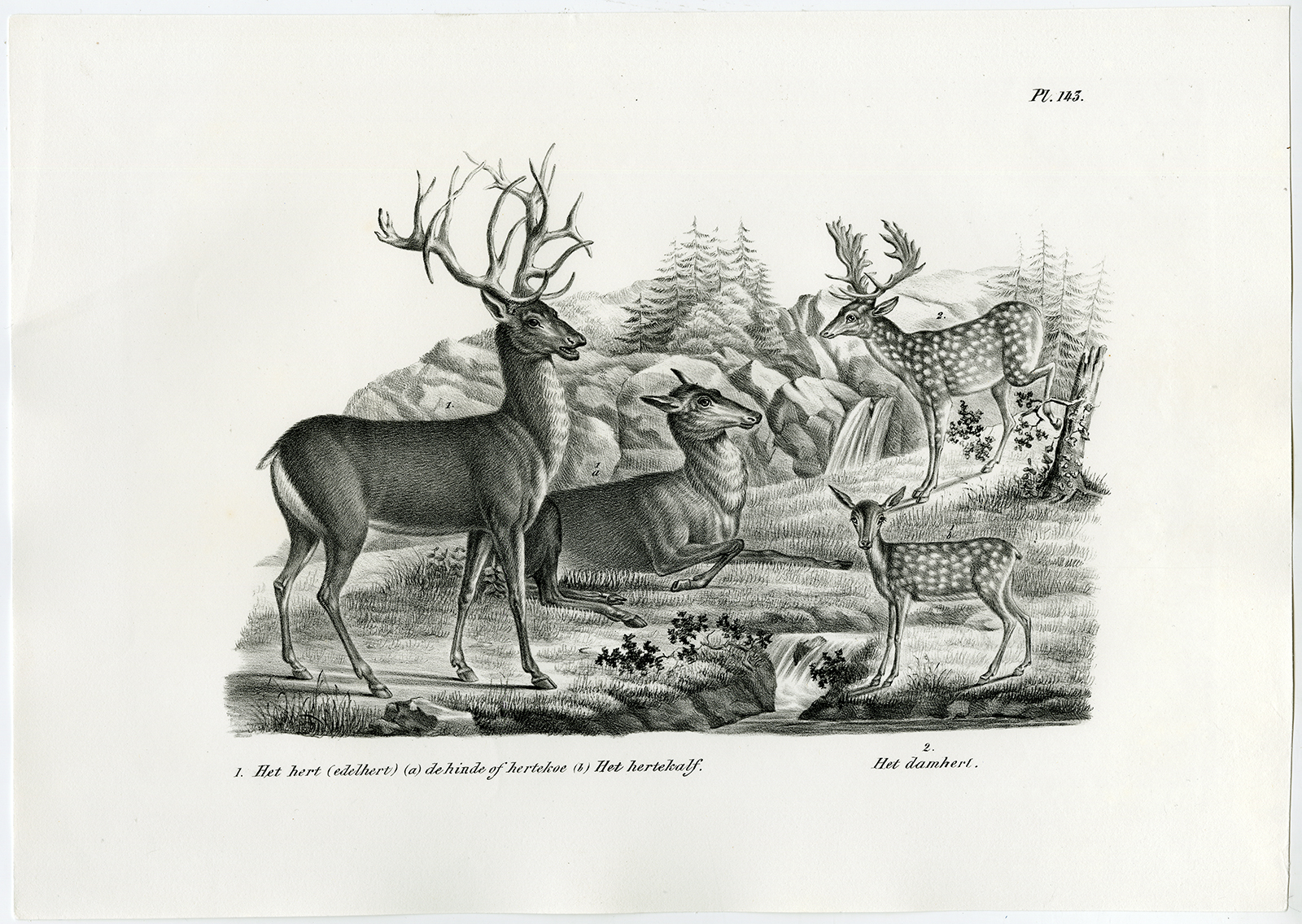 Onderwerp: Antieke prent, getiteld: ‘Pl. 143. Het Edelhert-Het Damhert.’ – Op dit bord zijn het Edelhert en Damhert afgebeeld.