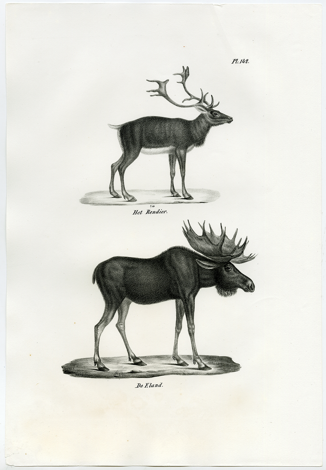 Onderwerp: Antieke prent, getiteld: ‘Pl. 142. Het Rendier-De Eland.’ – Dit bord toont het rendier en de eland of eland.