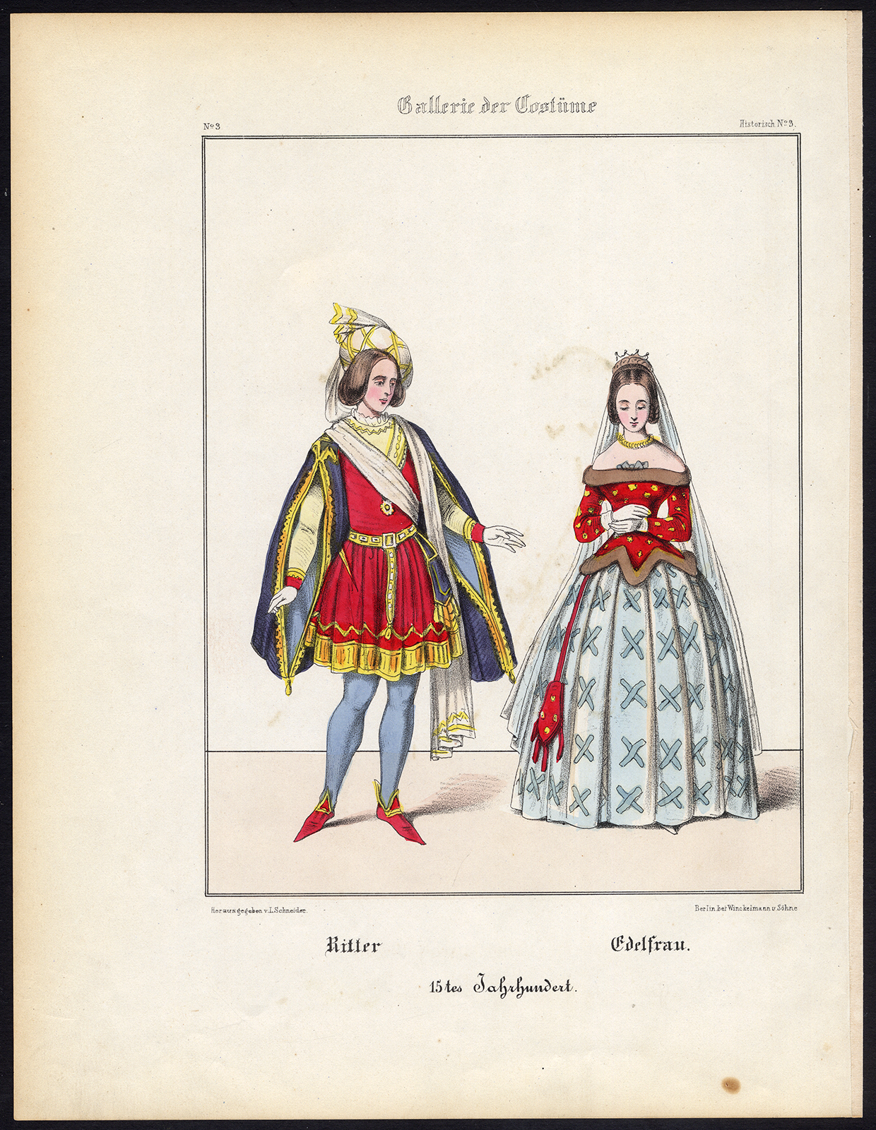 Antieke prent-RIDDER-NOBLE VROUW-DAME-15E EEUW-KOSTUUM-Schneider-1844