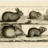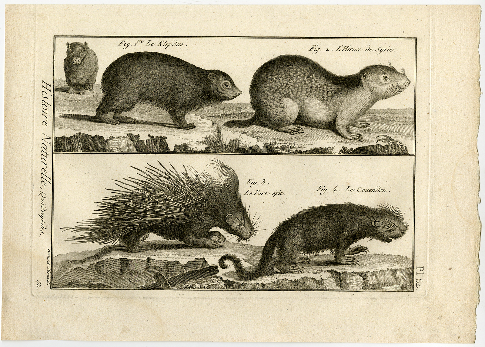 Onderwerp: Antieke prent, getiteld: ‘Pl. 64. Histoire Naturelle, Quadrupedes Afb. 1. Le Klipdas – 2. L’Hirax de Syrie – 3. Le Porc-Epic – 4. Le Couendou.’ – Op deze plaat zijn diverse knaagdieren afgebeeld; rotshyrax, stekelvarken, Braziliaans stekelvarken enz.