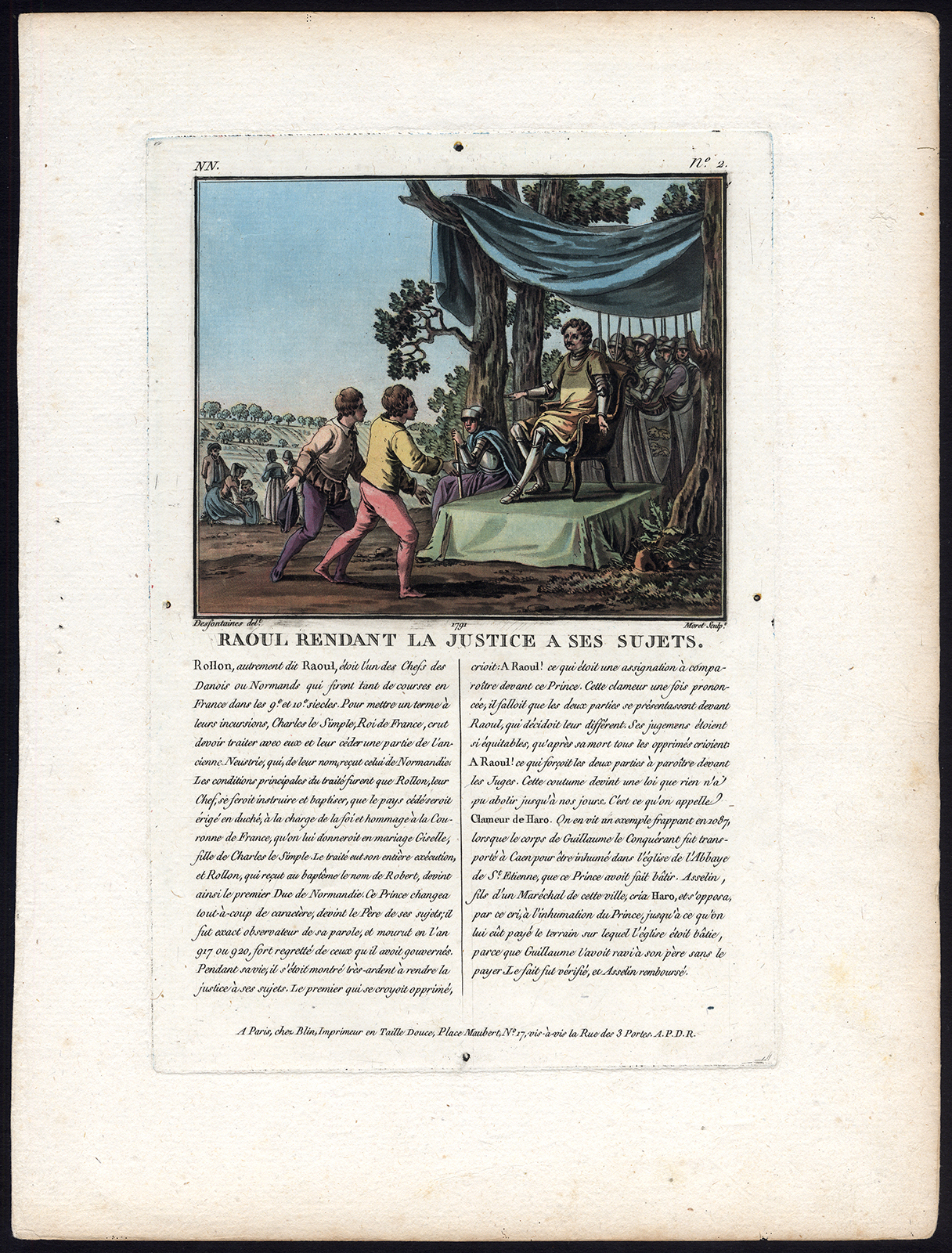 Onderwerp: Plaat: ‘Raoul rendeert la Justice a ses sujets.’ (Rollo oordeelt over zijn onderdanen). Rollo (ca. 846 – ca. 932), gedoopt Robert en soms ook Robert I genummerd om hem te onderscheiden van zijn nakomelingen, was een Noorse Viking die oprichter en eerste heerser was van het Viking-vorstendom dat al snel bekend werd als Normandië. Zijn nakomelingen waren de hertogen van Normandië, en na de Normandische verovering van Engeland in 1066, koningen van Engeland. Beschrijvende tekst in het Frans onder de afbeelding.