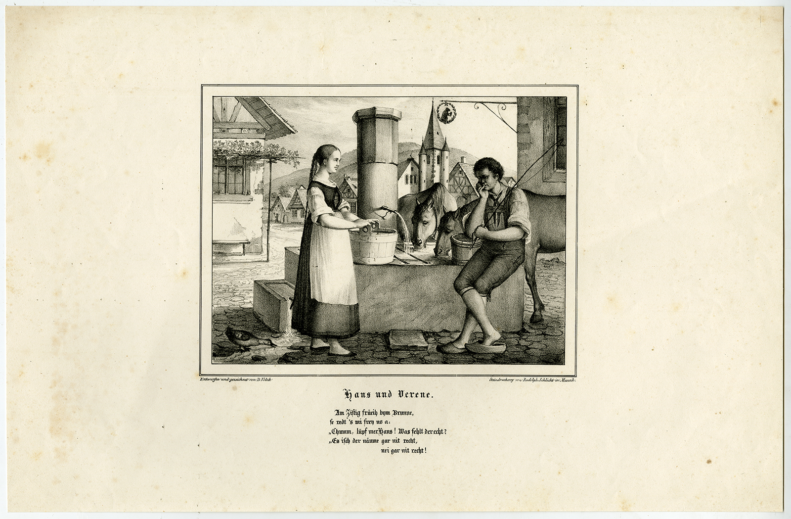 Onderwerp: Antieke prent, getiteld: ”Hans und Verene.” – Deze zeldzame originele antieke prent toont een romantisch tafereel met een jonge man en een jonge vrouw bij een waterput, twee paarden drinken. De titel vertaalt zich in ”Hans en Verene”. Hieronder een gedicht in het Duits.