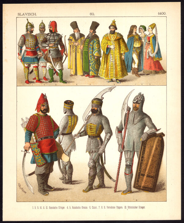 Onderwerp: Plaat 60: ‘Slavisch – 1400.’ Dit bord toont Slavische kostuums van rond 1400 na Christus; Russische soldaten, tsaar, Hongaarse adel, Boheemse soldaten enz.