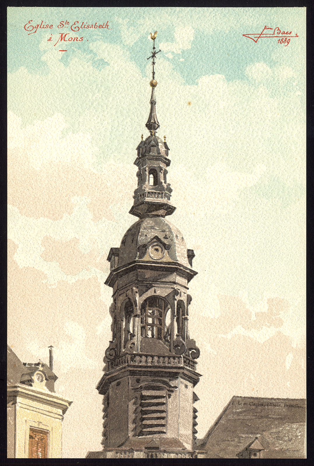 Onderwerp: Plaat: ‘Eglise Ste. Elisabeth van Bergen.’ Dit bord toont de kerk van Sint Elisabeth in Mons/Bergen, België.
