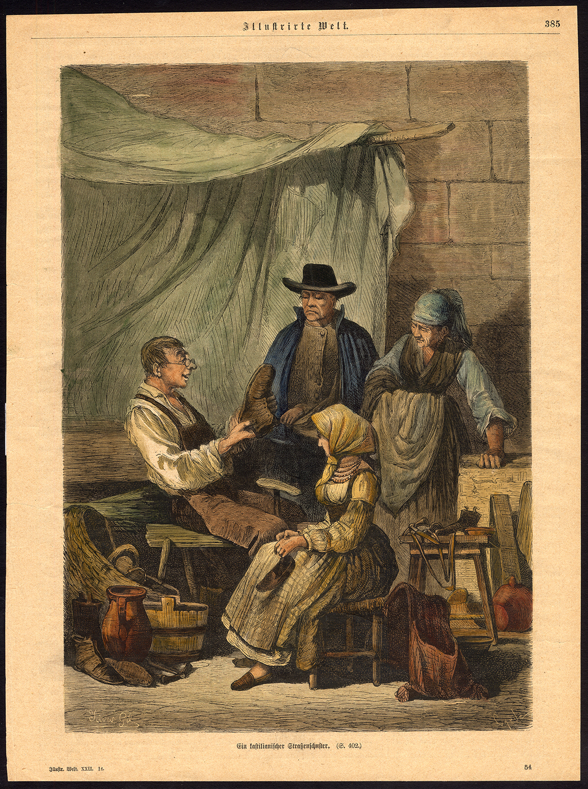 Onderwerp: Bord: ‘Ein Kastilianischer Strassenschuster.’ Dit bord toont een schoenmaker uit Castilië, Spanje.