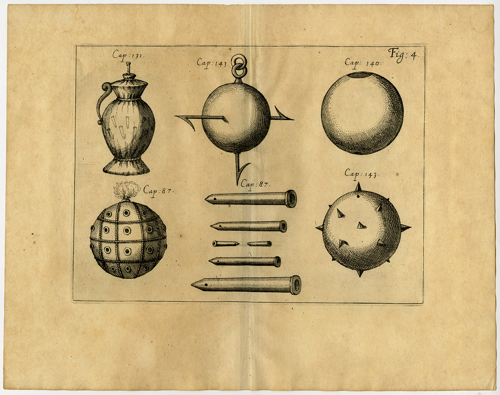 Onderwerp: Plaat Afb. 4: De platen uit deze publicatie tonen elk een aantal min of meer geïmproviseerde explosieve of brandende belegeringswerktuigen, zoals bommen (voor katapultlancering), vurige pijlen (voor kruisboog of ballista) en explosieve lopen. Bestudeer de scan voor meer informatie.