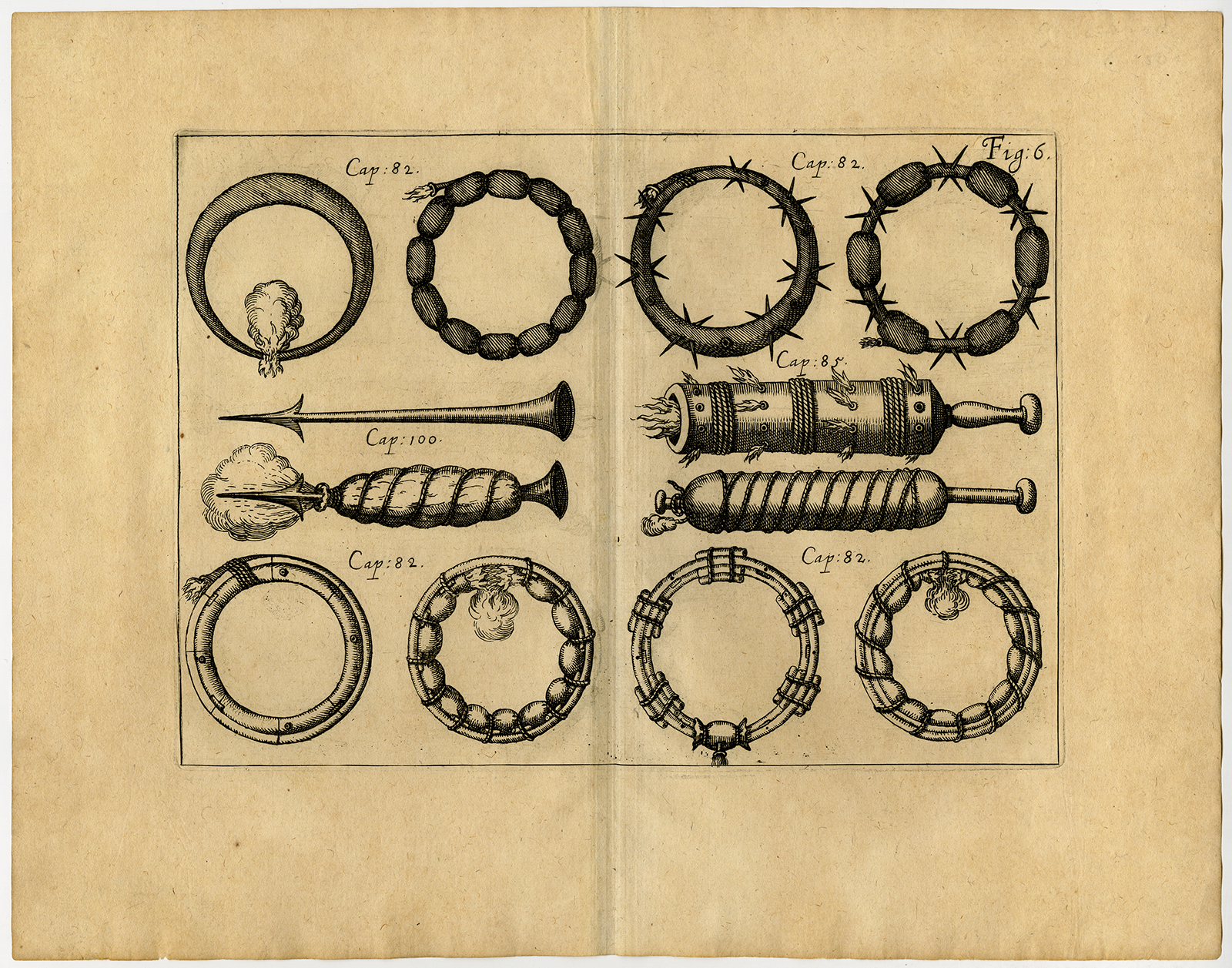 Onderwerp: Plaat Afb. 6: De platen uit deze publicatie tonen elk een aantal min of meer geïmproviseerde explosieve of brandende belegeringswerktuigen, zoals bommen (voor katapultlancering), vurige pijlen (voor kruisboog of ballista) en explosieve lopen. Bestudeer de scan voor meer informatie.