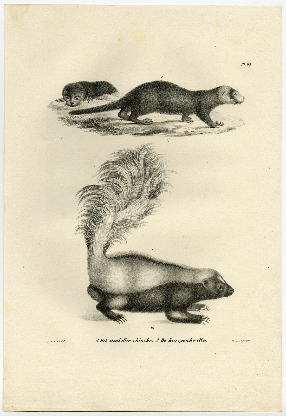 Onderwerp: Antieke prent, getiteld: ‘Plaat 61: ‘1. Het stinkdier chinche – 2. De Europesche otter’.’ – Op dit bord zijn de 1. stinkdier – 2. Europese otter afgebeeld.