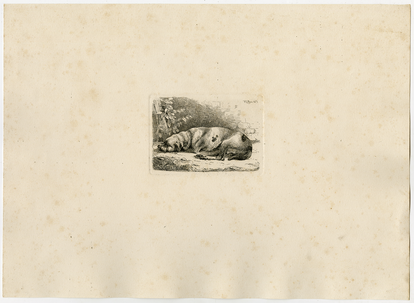 Onderwerp: Antieke druk, zonder titel. Deze print toont een slapende hond.