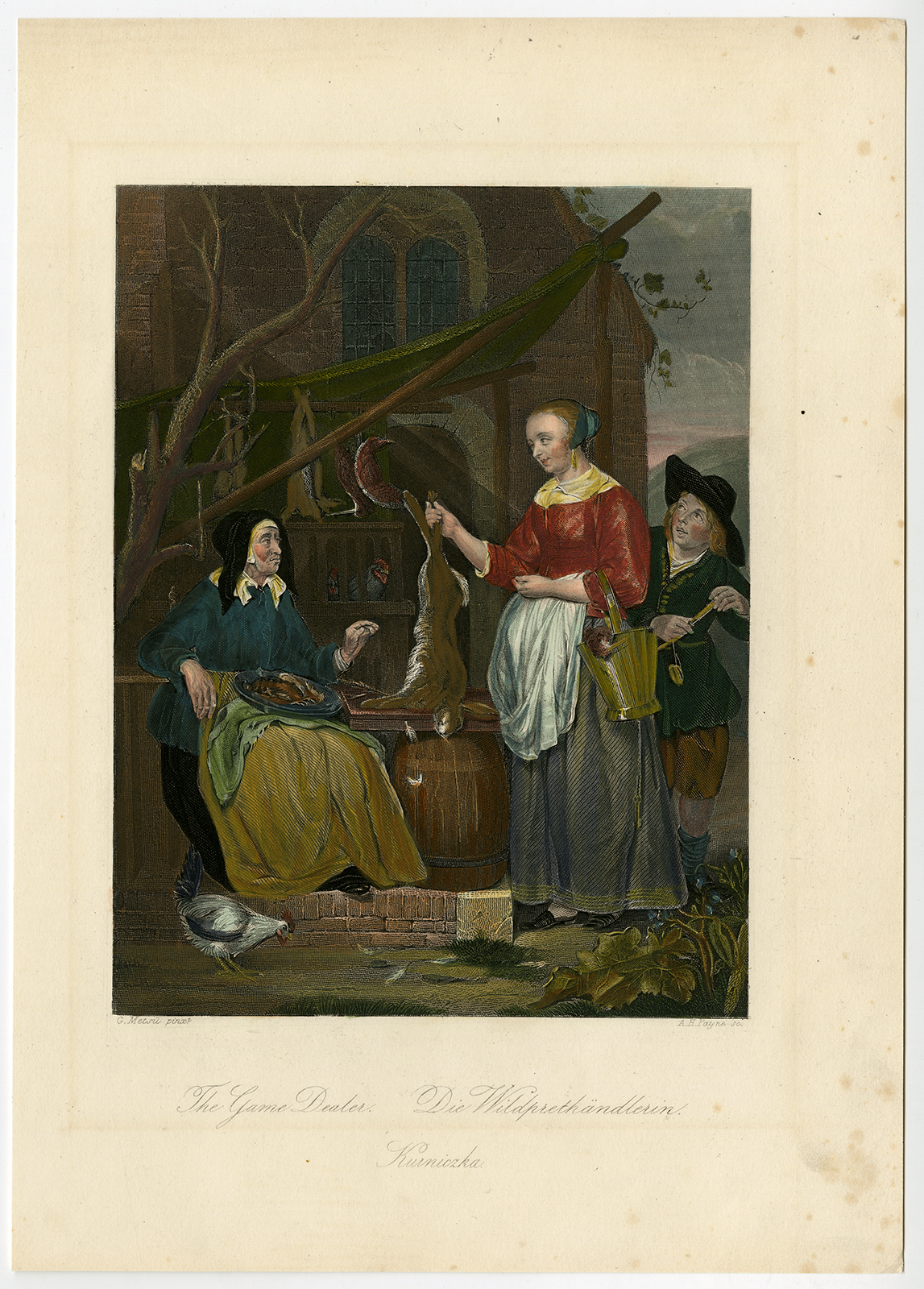 Onderwerp: Plaat: ‘The Game Dealer – Die Wildprethandlerin’. Dit bord toont een spelhandelaar die een haas verkoopt.