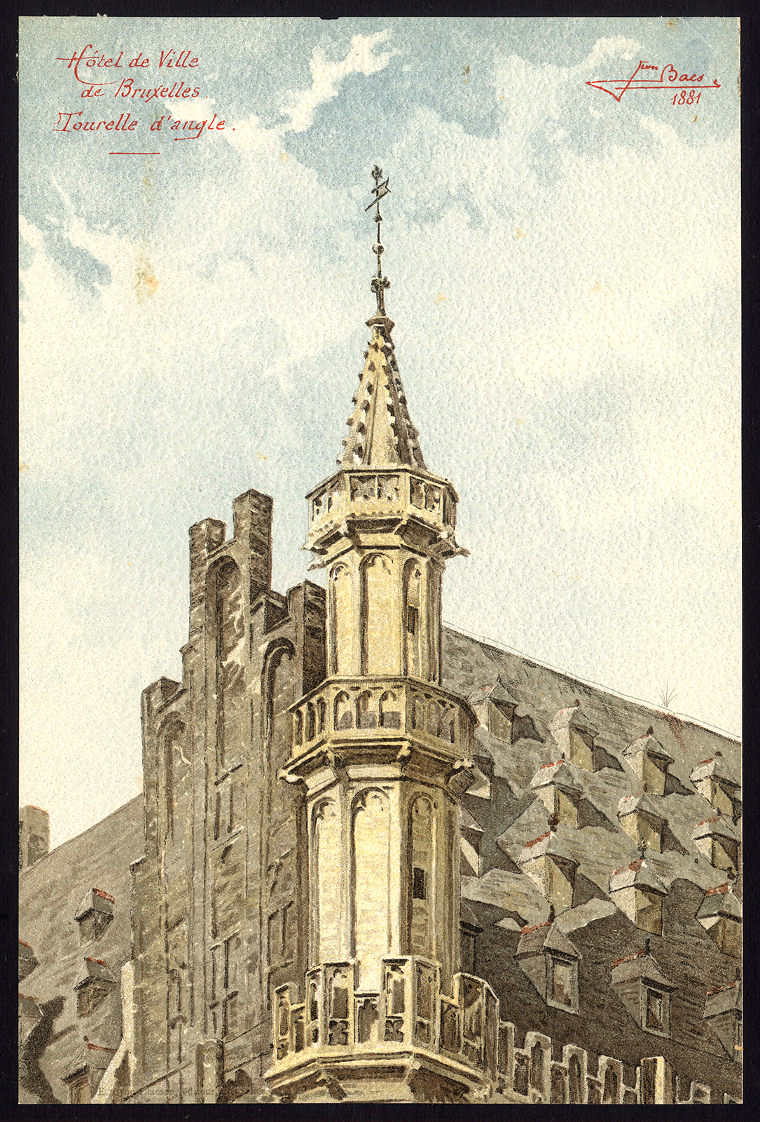Onderwerp: Plaat: ‘Hotel de Ville de Bruxelles – Tourelle d’angle.’ Dit bord toont een torentje van het stadhuis van Brussel / Bruxelles, België.