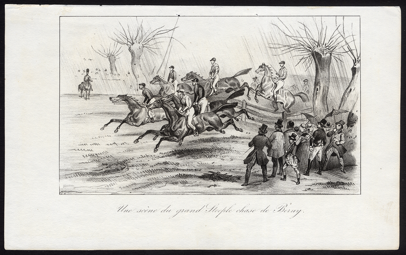 Onderwerp: Plaat: ‘Une scene du grand Steeple Chase de Berny’. Dit bord toont een paardenrace met torenachtervolging in Berny, Frankrijk.