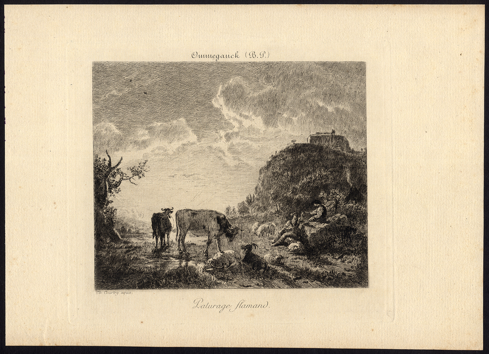 Kunstenaars en graveurs: Deze plaat geëtst door C. Courtry naar B. Ommeganck. Balthasar Paul Ommeganck (1755 – 1826) was een Vlaamse schilder van landschappen en dieren. Door zijn werk en zijn rol als docent gaf hij een belangrijke impuls aan de revitalisering van de landschapsschilderkunst in de Lage Landen.