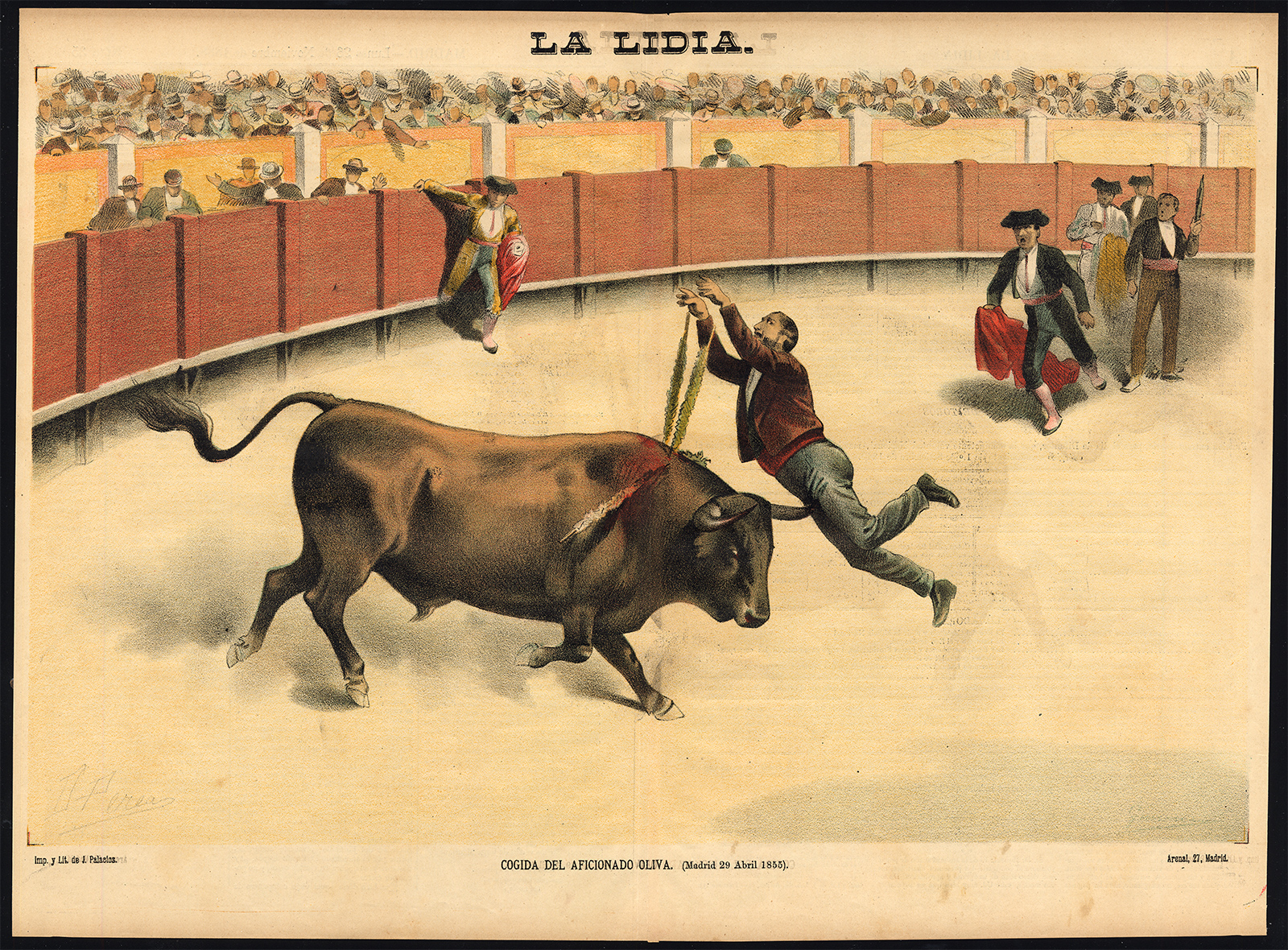 Onderwerp: Bord 35 – 1888: ‘Cogida del aficionado Oliva, Madrid 29 april 1855.’ Dit bord toont een stierenvechttafereel in een Spaanse arena.