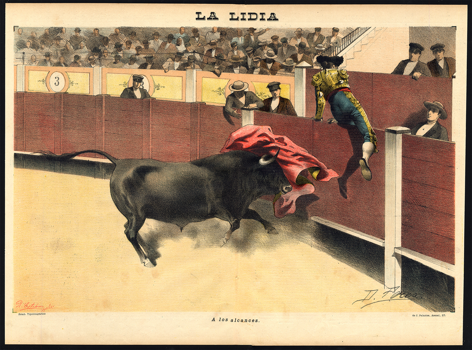 Onderwerp: Plaat 8 – 1892: ‘A los alcanses.’ Dit bord toont een stierenvechttafereel in een Spaanse arena.