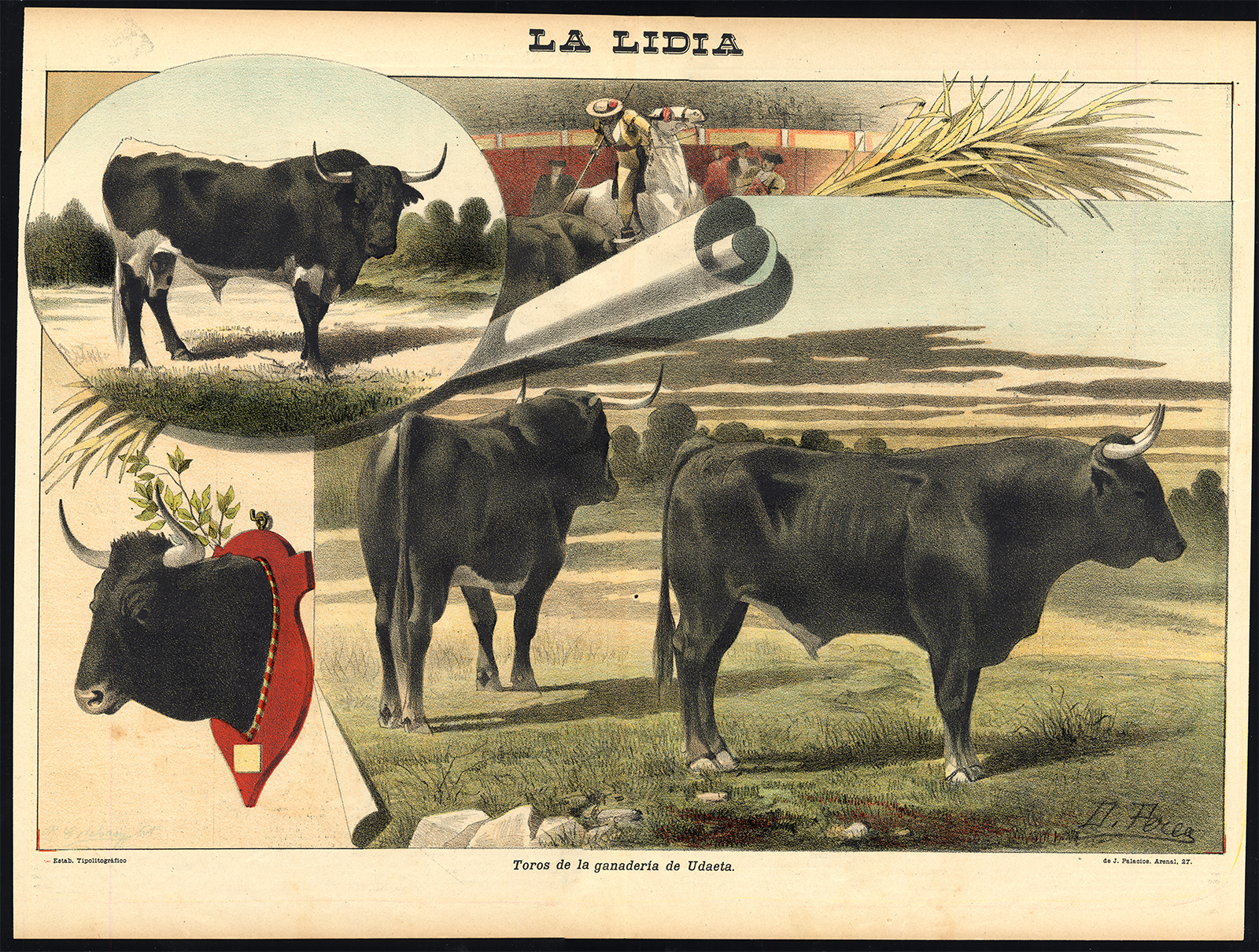 Onderwerp: Plaat 13 – 1893: ‘Toros de la ganaderia de Udaeta.’ Op dit bord zijn diverse Spaanse Udaeta vechtstieren afgebeeld.