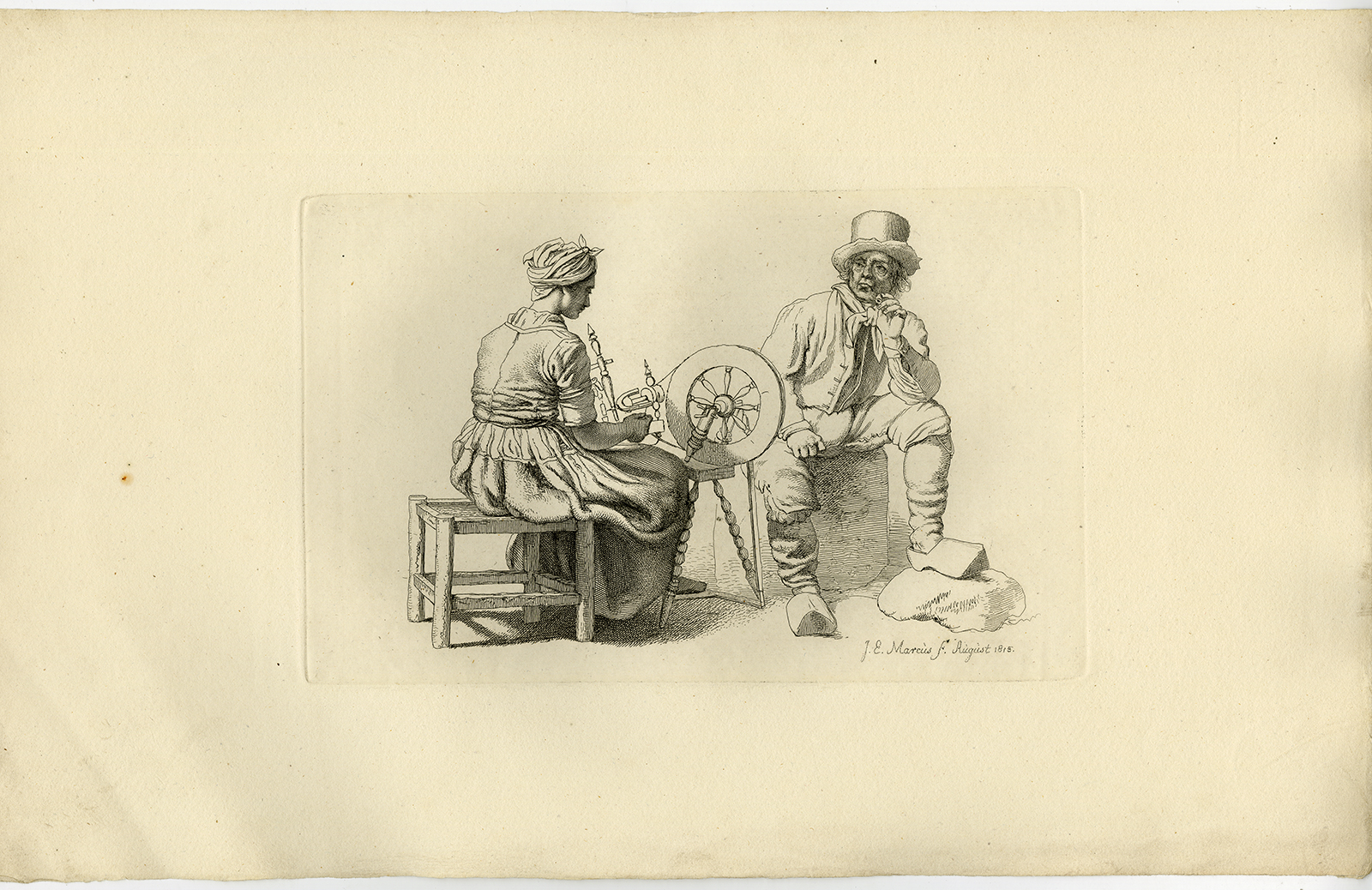 Onderwerp: Antieke druk, zonder titel. Een vrouw zittend aan een spinnewiel, met rechts een zittende man op klompen die een pijp rookt.