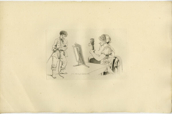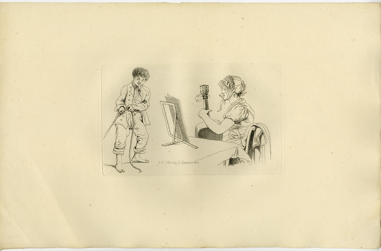 Antieke prent-STUDIE-GITAAR-BLAD MUZIEK-MAN TREKT TOUW-1810-Marcus-1834