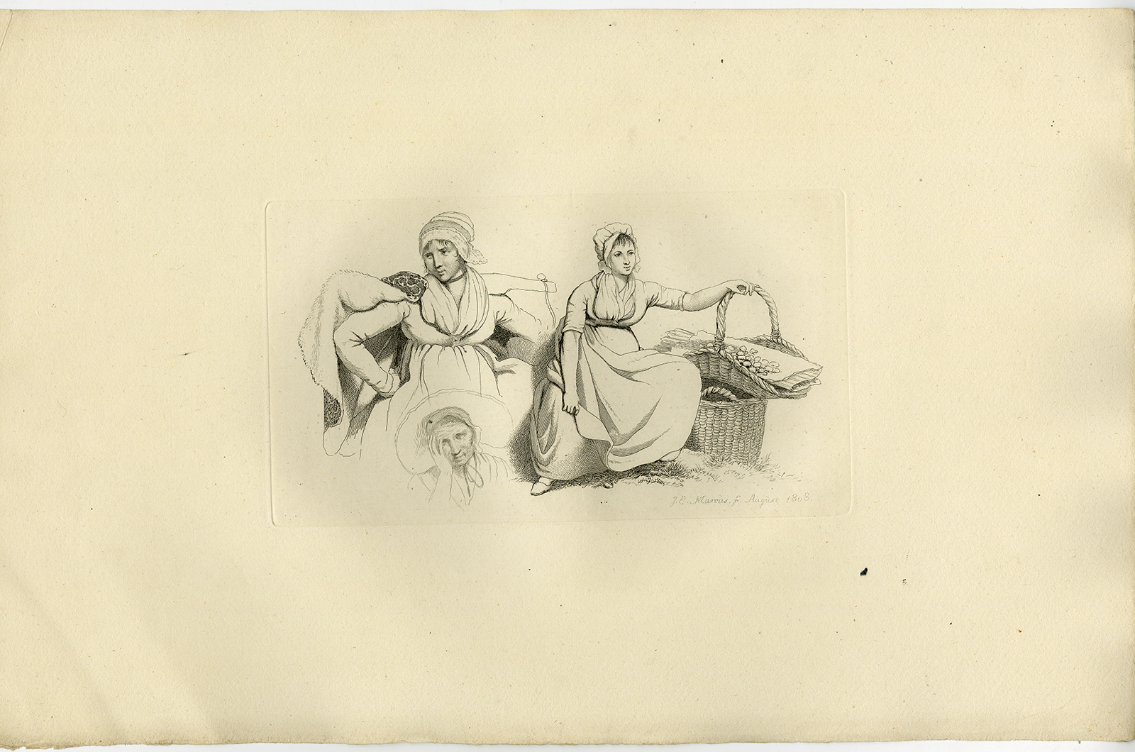 Onderwerp: Antieke druk, zonder titel. Drie vrouwenstudies: een portret van een oude vrouw met het hoofd op de hand leunend, een zittende vrouw naast twee manden met verse producten, en een vrouw in klederdracht met een draagjuk op haar schouder.