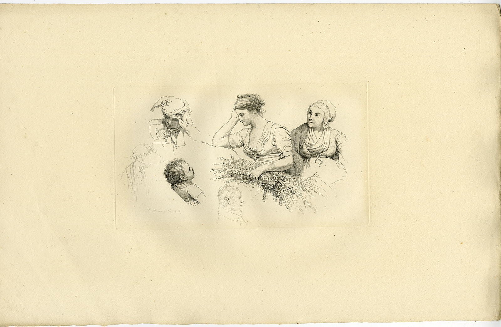 Onderwerp: Antieke druk, zonder titel. Een studie met portretten en figuren in diverse posities en vanuit diverse hoeken; Rustende vrouw die een korenschoof vasthoudt.