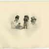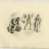 Onderwerp: Antieke druk, zonder titel. Vier figuurstudies: een zittende man met bontmuts, schetsetsen van een jager en een boerenjongen en een portret van een vrouw.