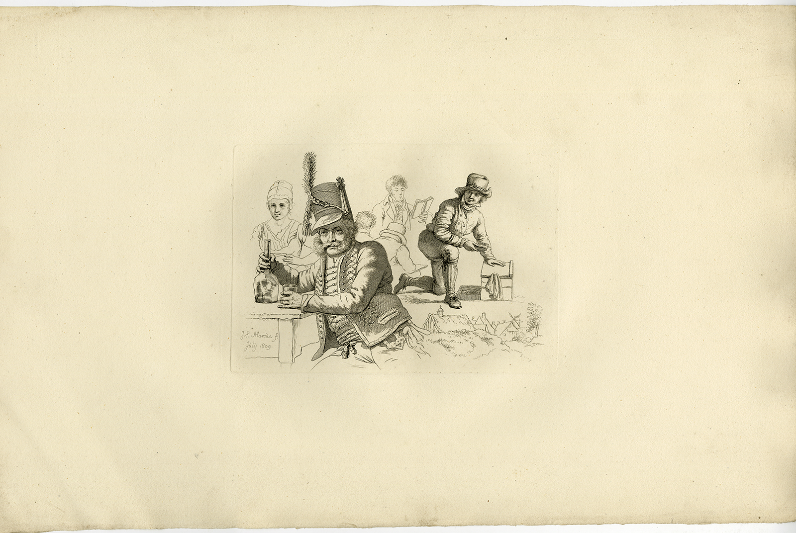 Onderwerp: Antieke druk, zonder titel. Een studie van mensen in verschillende posities en een landschap. Op de voorgrond een militaire officier, zittend aan een tafel met een glas en een fles. Een man die uit een boek voorleest aan twee andere mannen, boog zich over bureaus. Een man geknield bij een schoenpoetsdoos en een vrouwelijk portret.