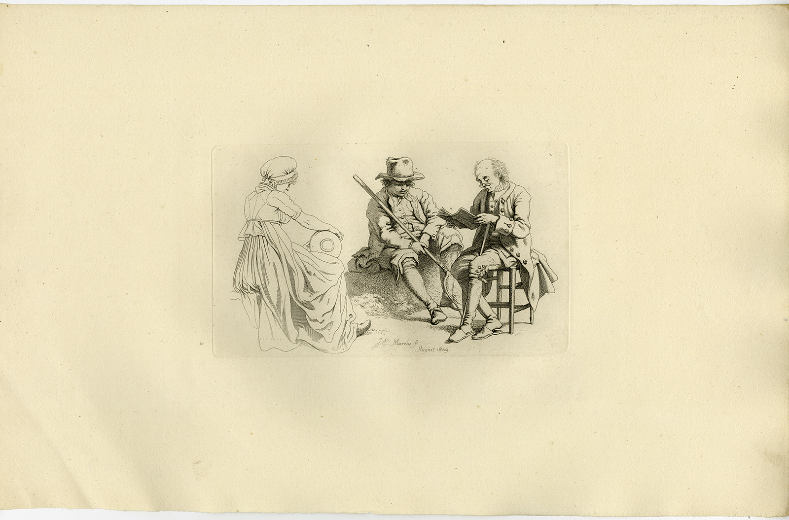 Kunstenaars en graveurs : Gemaakt door ‘JE Marcus’ naar eigen ontwerp. Jacob Ernst Marcus (1774 – 1826) begon in 1807 met zijn serie van 105 geëtste landschappen, studies en portretten die maandelijks verschenen. In 1834 werden de platen herdrukt op dikker papier (deze uitgave).