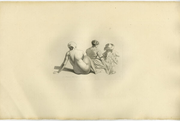 Onderwerp: Antieke druk, zonder titel. Drie studies: een naakte vrouw van achteren gezien; een zittende (geklede) vrouw; een man met een hoed die zijn hoofd op zijn vuist leunt.