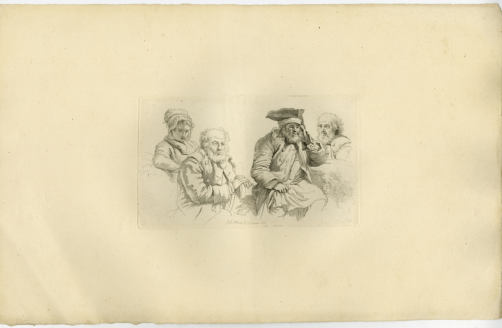 Onderwerp: Antieke druk, zonder titel. Figuurstudies: Een vrouw en drie oude mannen (één met een driekantige hoed).