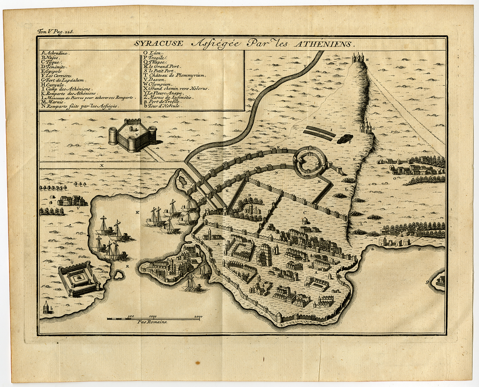 Antieke prent-SYRACUSE-PLAN-SICILIË-ITALIË-SIEGE-ATHENIANS-SHIPS-1750