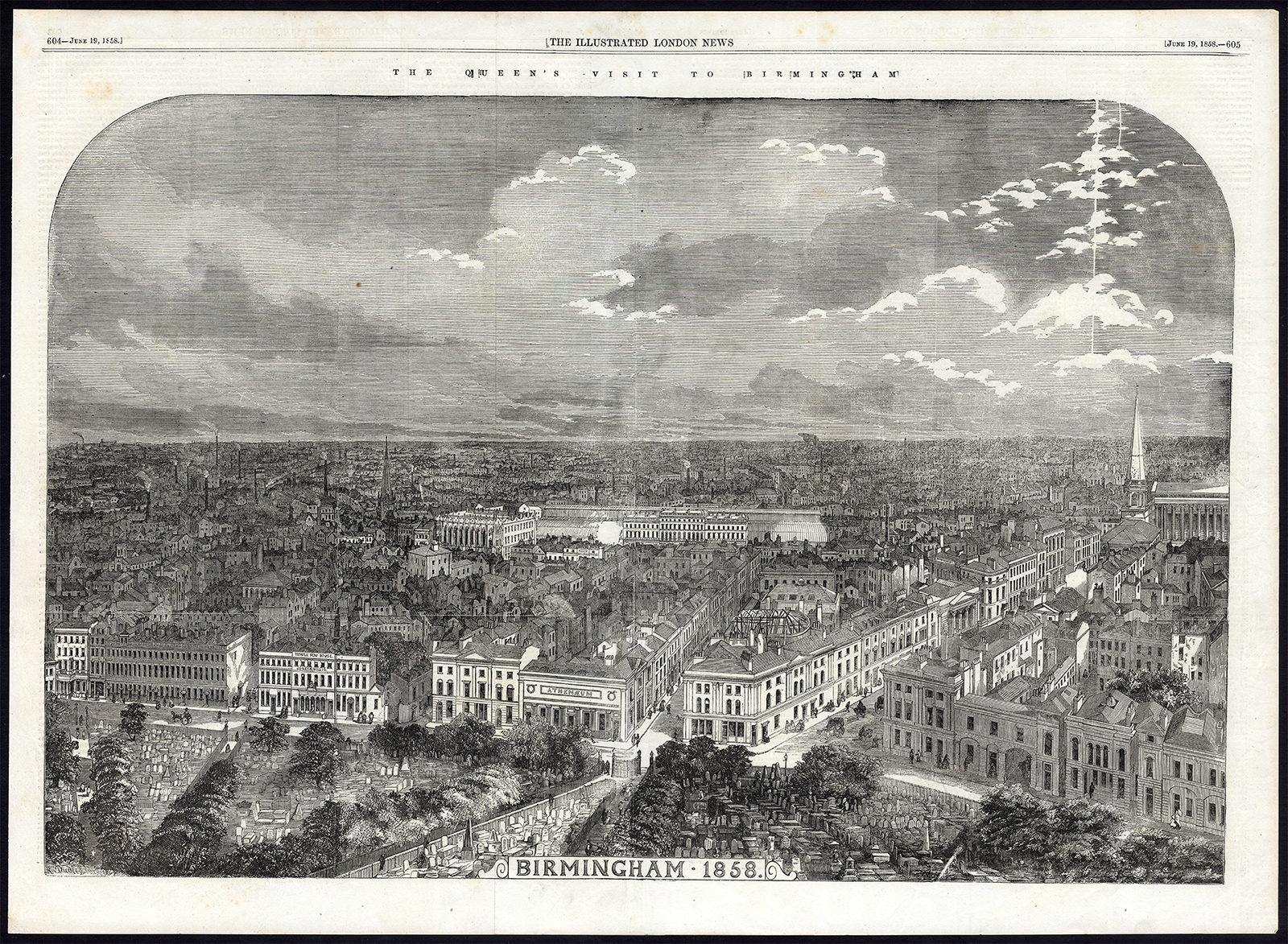 Onderwerp: Plaat: ‘Bezoek van de koningin aan Birmingham, 1858.’ Uitzicht op de stad Birmingham, Engeland. Tekst op achterzijde.