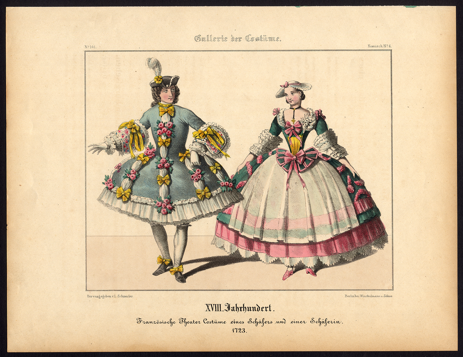 Onderwerp: Plaat: ‘XVIII Jahrhundert. Franzosische Theaterkostuum eines Schafers und einer Schaferin, 1723’. (18e eeuw. Frans theaterkostuum van een herder en zijn vrouw, 1723).