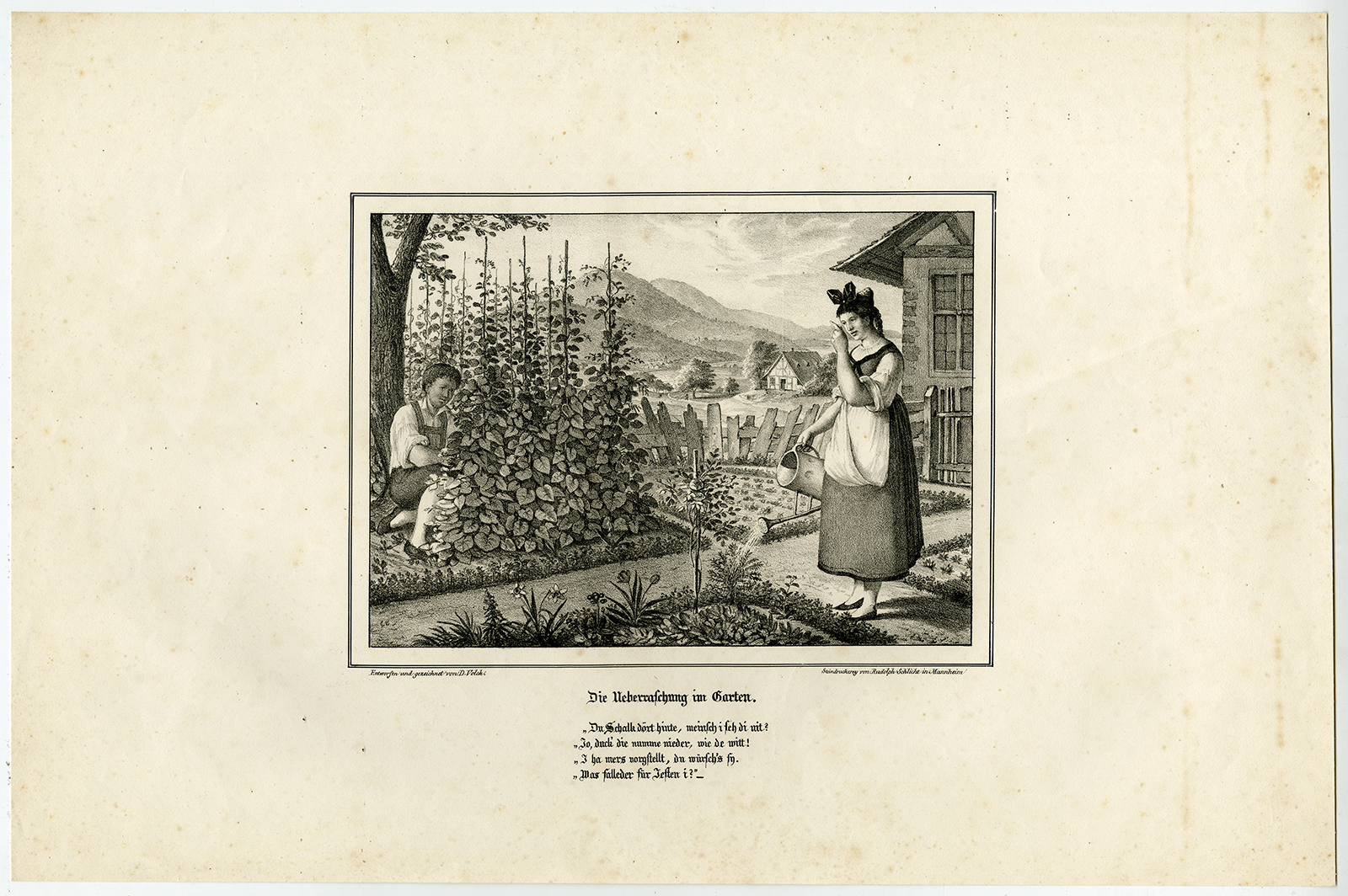 Onderwerp: Antieke prent, getiteld: ”Die Ueberraschung im Garten.” – Deze zeldzame originele antieke prent toont een landelijk tafereel met een jongen of jongeman die zich verstopt voor een vrouw in de tuin. De titel vertaalt zich in ”De verrassing in de tuin”. Hieronder een gedicht in het Duits.