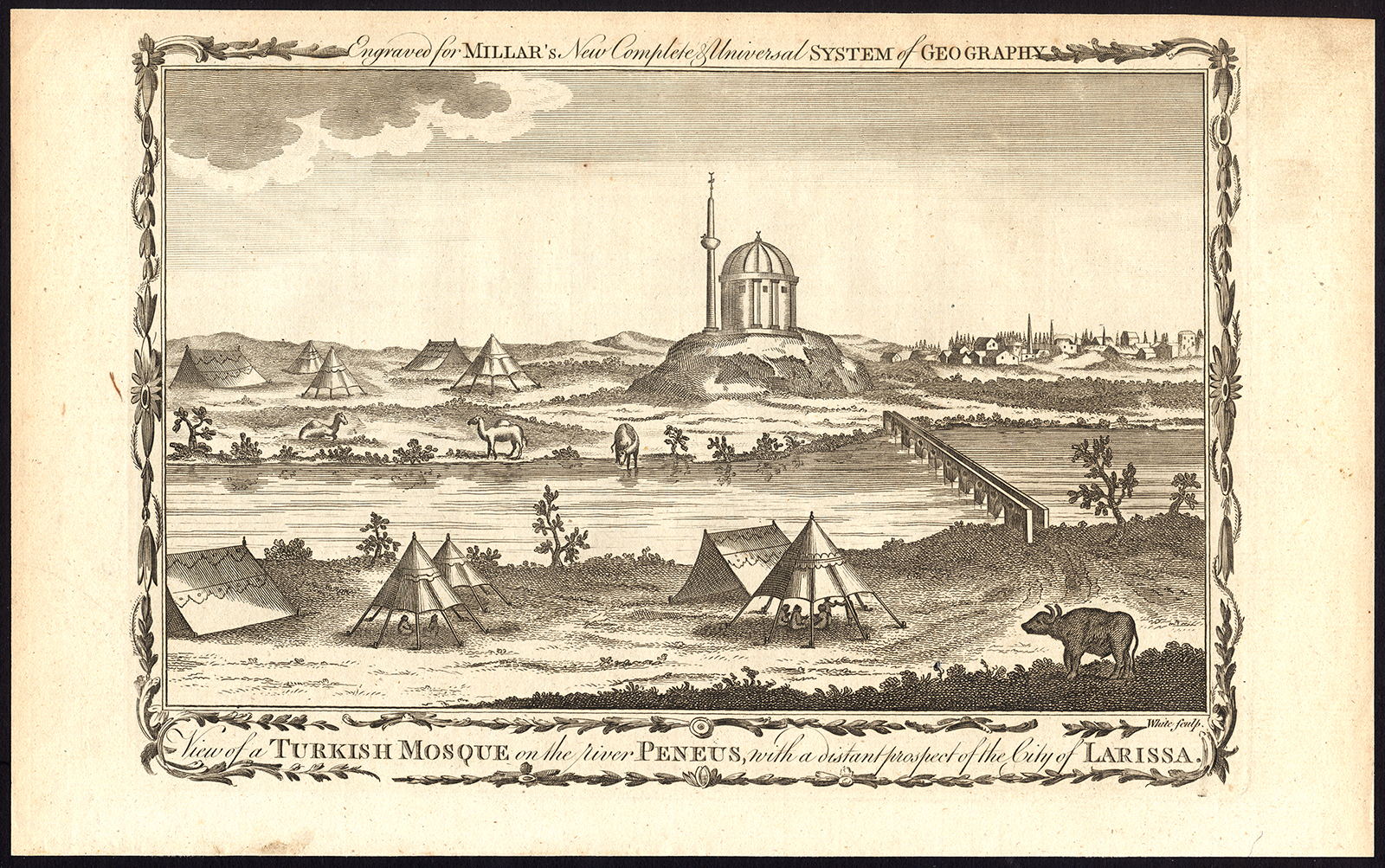Antieke prent-TURKIJE-MOSKEE-LARISSA-GRIEKENLAND-PENEUS-CAMEL-White-1782