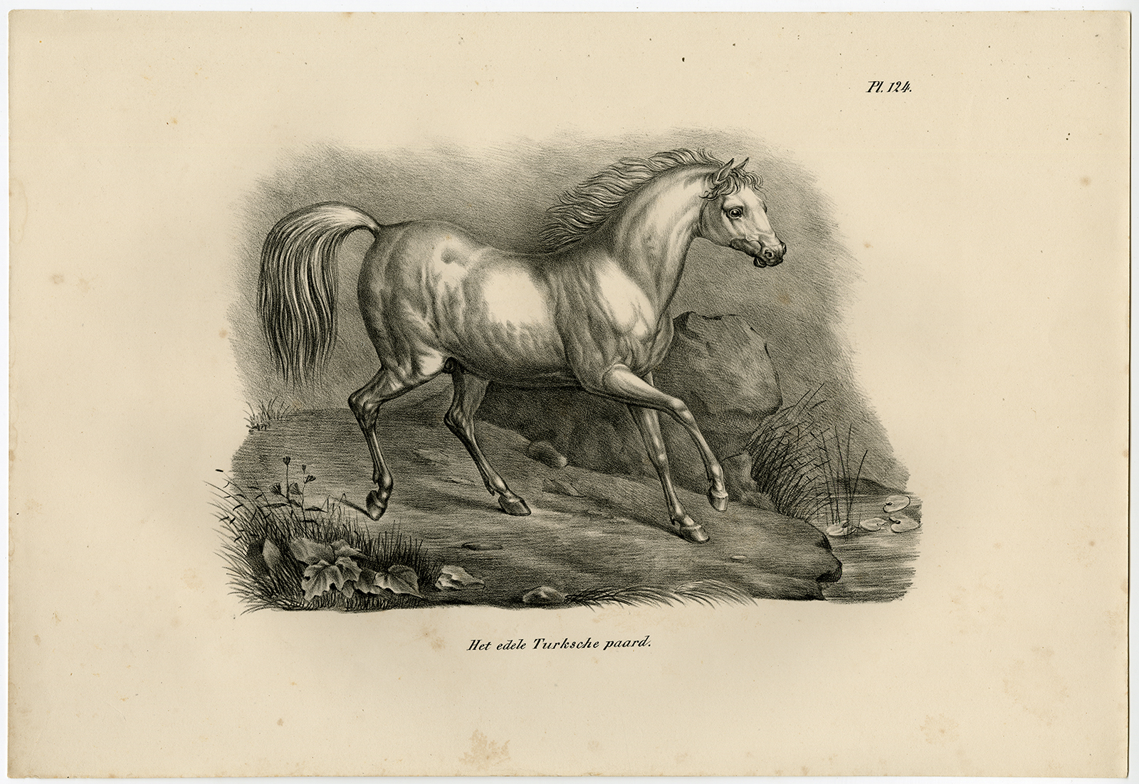 Onderwerp: Antieke prent, getiteld: ‘Plaat 124: ‘Het edele Turksche paard’.’ – Dit bord toont het Turkse paard.