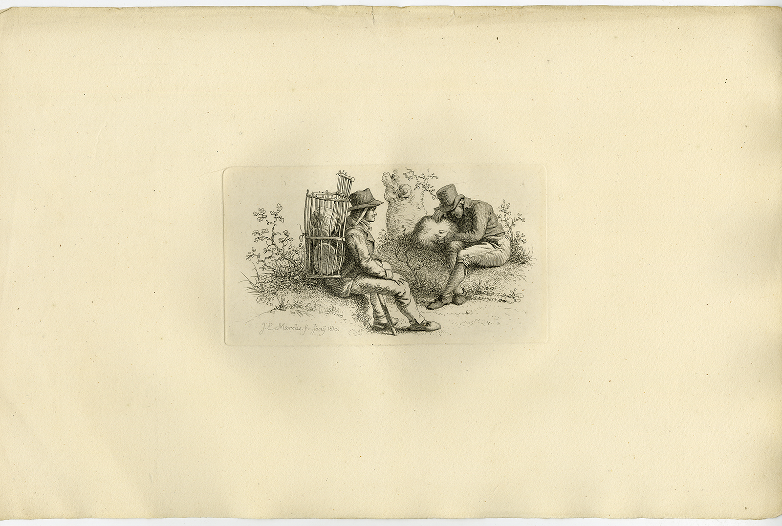 Onderwerp: Antieke druk, zonder titel. Twee mannen zittende rustende mannen, de linker is waarschijnlijk een marskramer en heeft een mand op zijn rug.