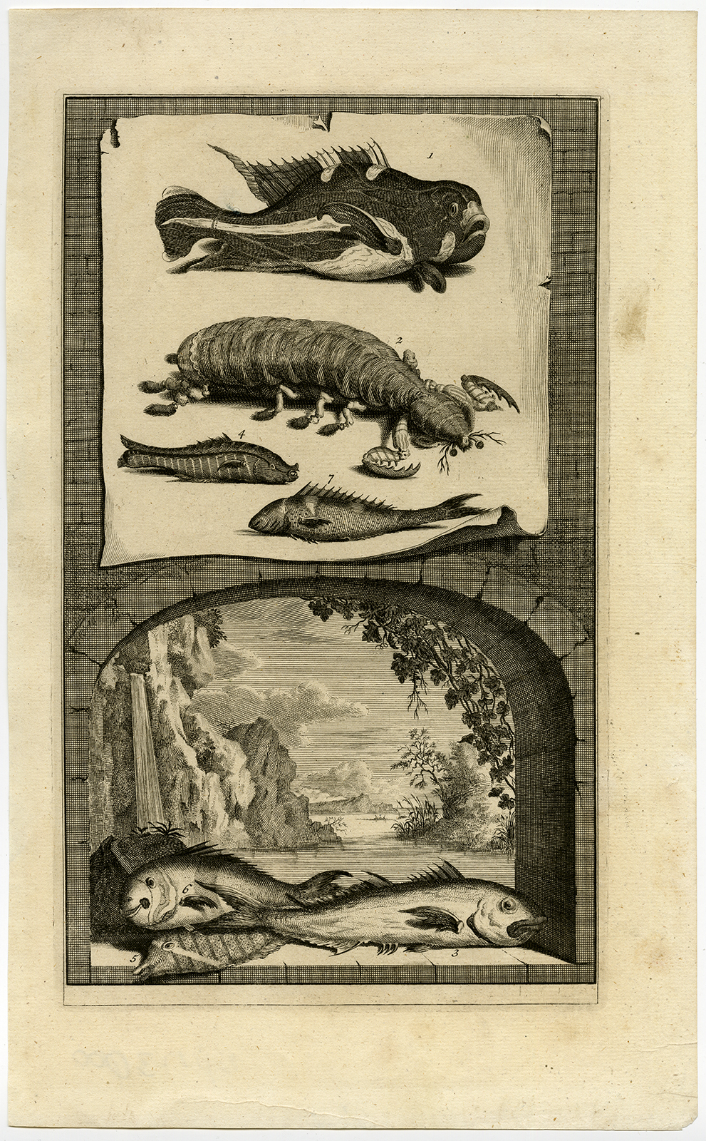 Onderwerp: Antieke druk, zonder titel. Dit bord toont exotische vissoorten uit Indonesië.