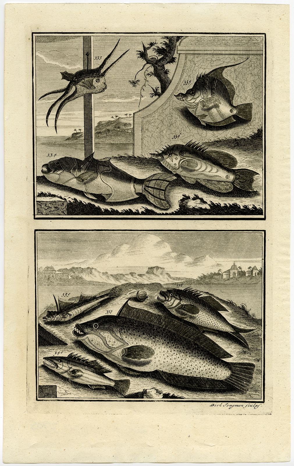 Onderwerp: Antieke druk, zonder titel. Dit bord toont exotische vissoorten uit Indonesië.