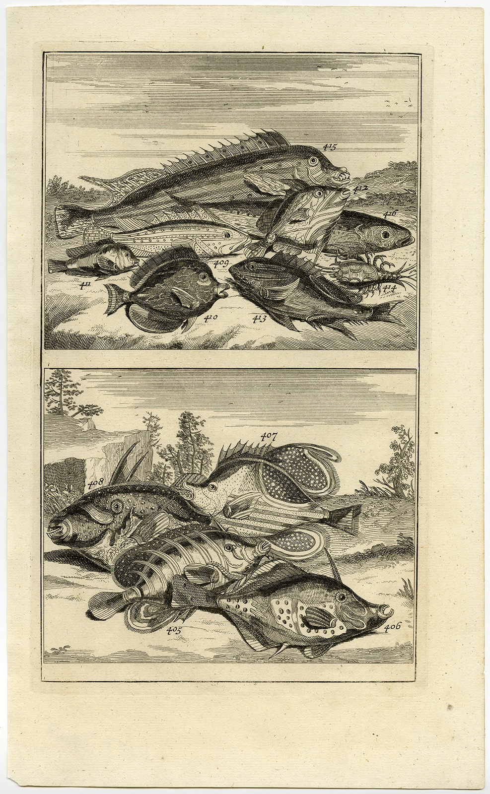 Onderwerp: Antieke druk, zonder titel. Dit bord toont exotische vissoorten uit Indonesië.