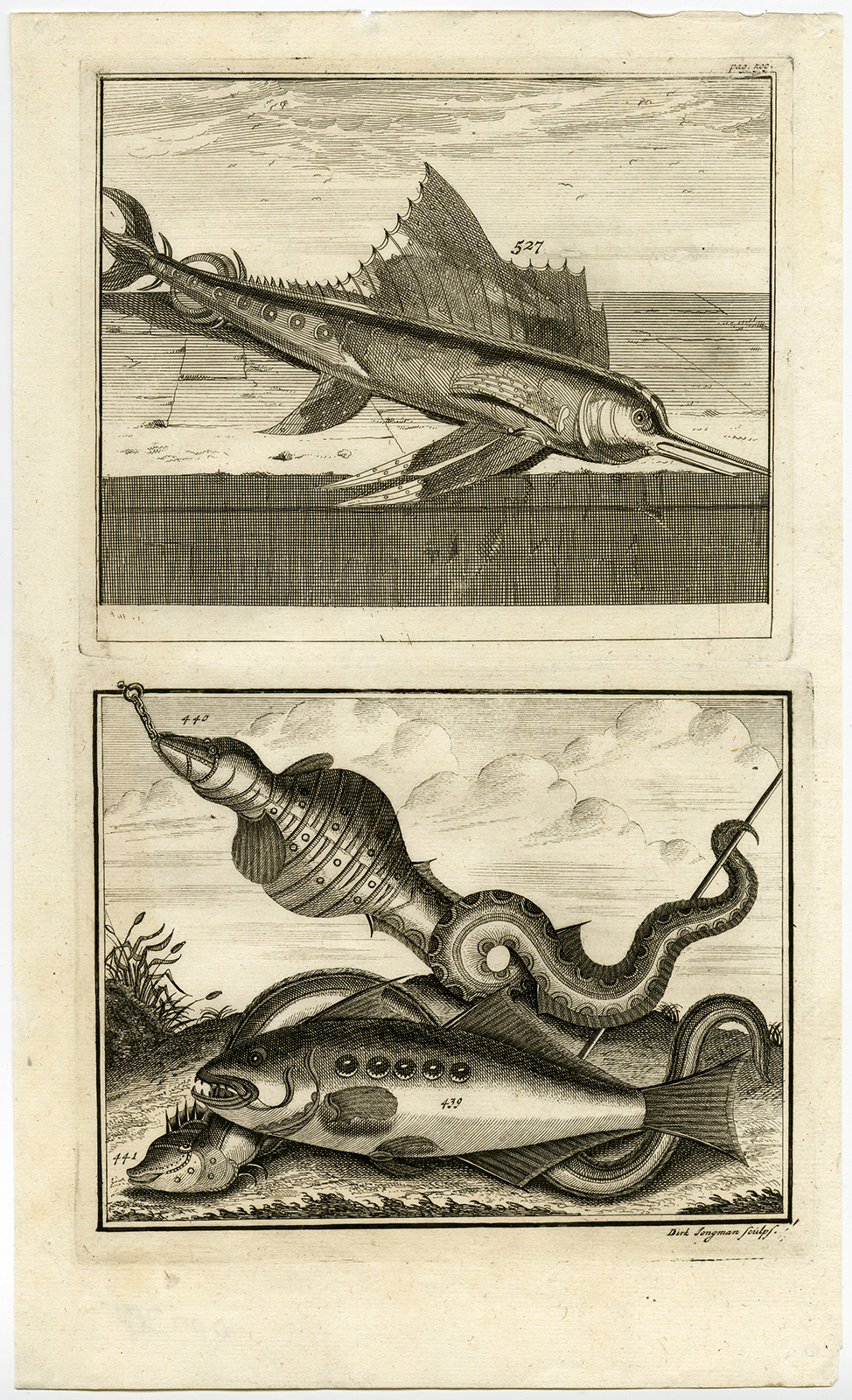 Onderwerp: Antieke druk, zonder titel. Dit bord toont exotische vissoorten uit Indonesië.