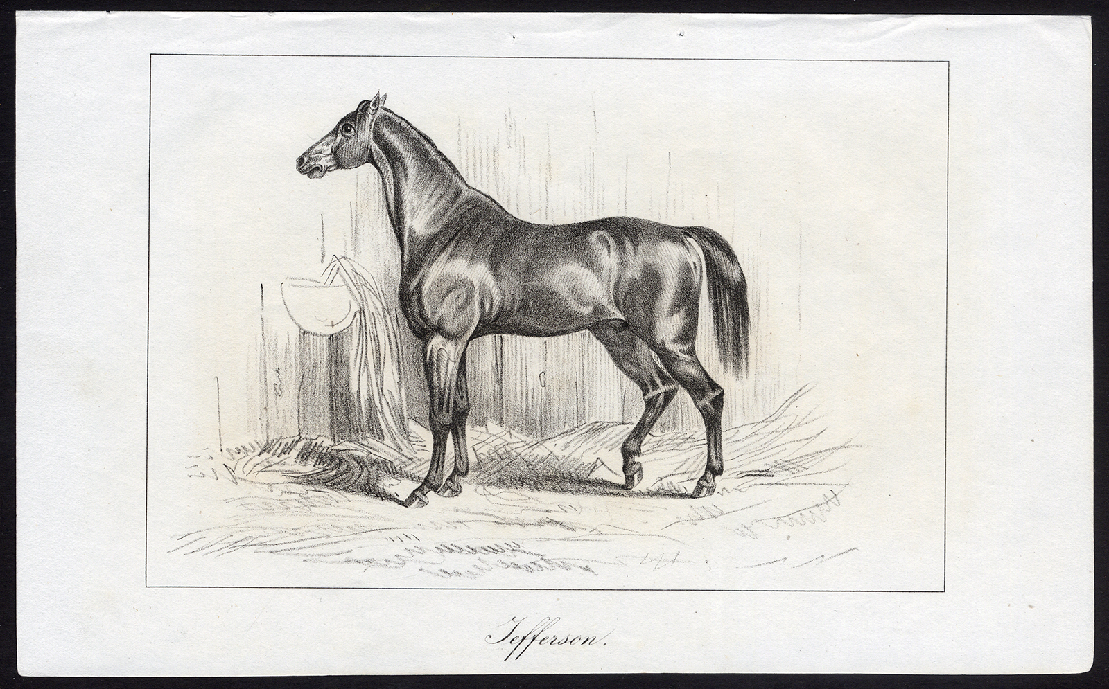 Onderwerp: Plaat: ‘Jefferson’. Dit bord toont Jefferson, een volbloed renpaard.