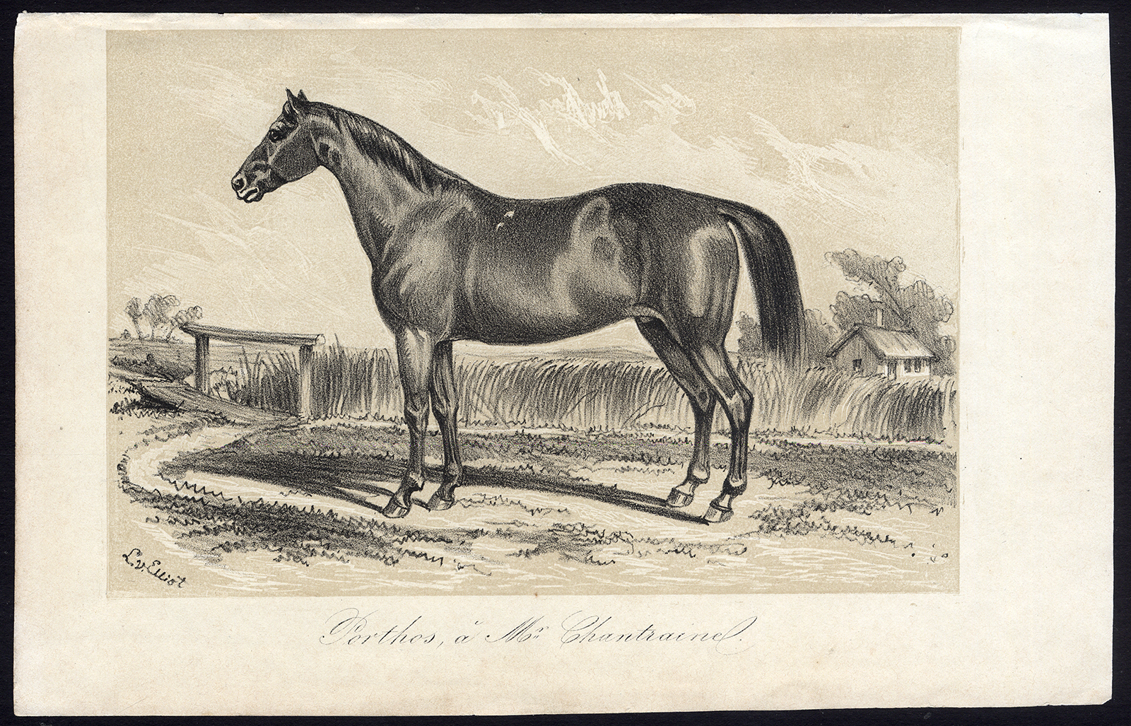 Antieke prent-volbloed renpaard-PORTHOS-CHANTRAINE-Journal des Haras-1857