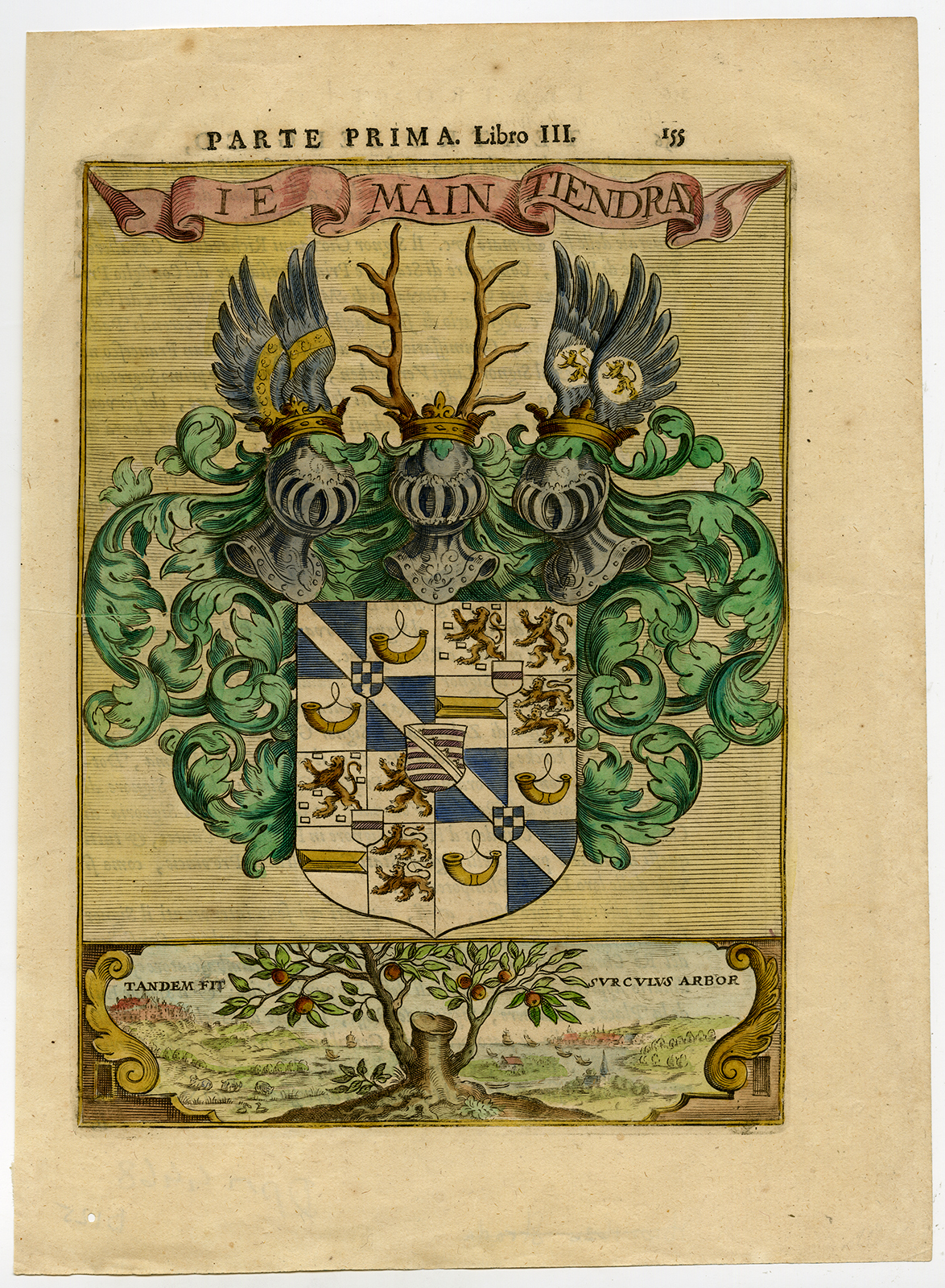 Onderwerp: Antieke prent, getiteld: ”Je Main Tiendray (à).” – Deze originele antieke prent toont een 17e eeuws wapen van Nederland/België.