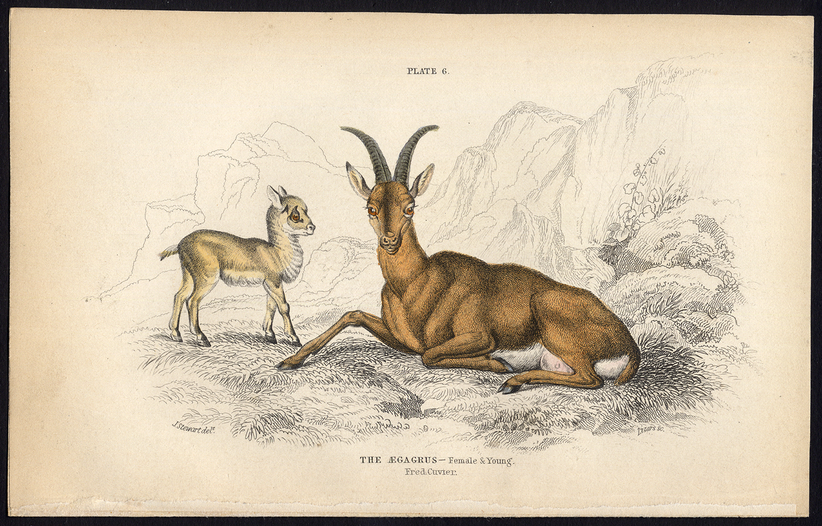 Onderwerp: Plaat 6: ‘De Aegagrus, vrouwelijk & jong’. Dit bord toont de wilde geit (Capra aegagrus), vrouwelijk en jong.